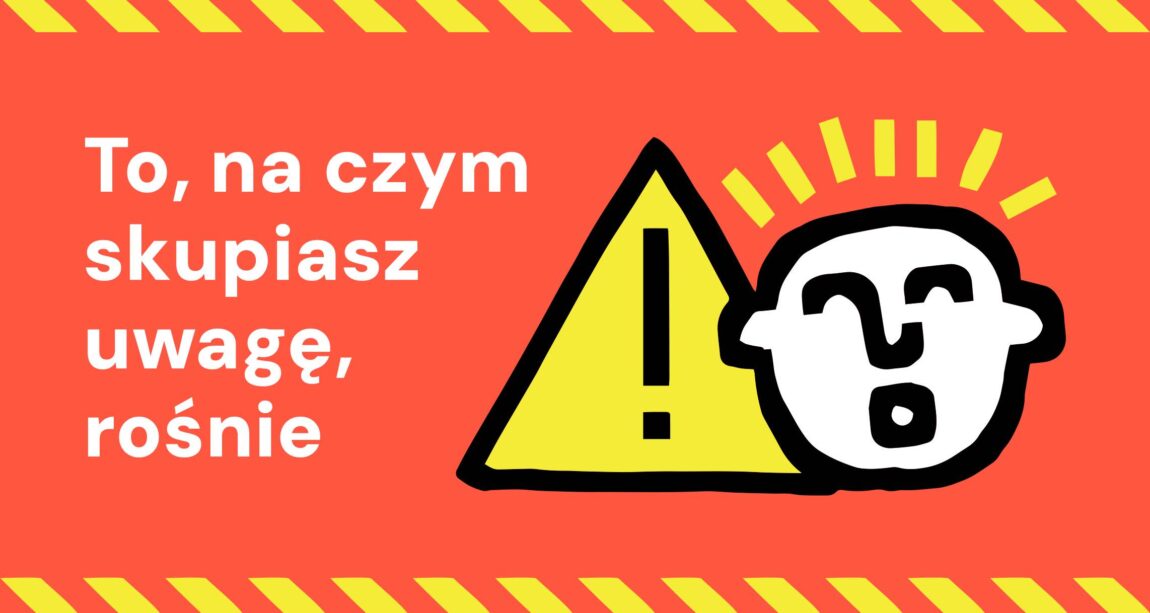 Jeżeli teraz czujesz, że wszystkiego jest za dużo i jesteś zagubiona/y, to mocny znak, żeby na początek zaopiekować się swoją uwagą na dwóch poziomowach, bo Uwaga: Ty! mówi o dwóch rzeczah – Twoja uwaga należy do Ciebie i „hej, chodzi o Ciebie”.